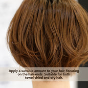 • Pour a suitable amount onto your hands and rub into your hair, focusing on the ends. Suitable for both towel-dried and dry hair.