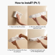 Upgrade your bathroom storage with this no-drill rack, designed for easy installation and durability. Made from sturdy ABS plastic, it holds up to 4-5kg depending on the size, features large drainage holes, and includes hooks for hanging accessories.
