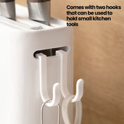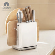 Keep your kitchen organized and clutter-free with this multifunctional knife and chopping board stand, designed for modern, space-conscious homes. Made from durable, waterproof ABS and rustproof powder-coated iron, this sleek white organizer is both stylish and highly functional. It features dedicated slots for knives, scissors, and sharpening tools, along with a chopping board holder and additional hooks for small kitchen accessories. The ventilated design promotes airflow, preventing moisture buildup and bacteria growth, while a detachable water tray ensures your countertop stays clean and dry. Its compact size maximizes storage efficiency, making it an ideal choice for small kitchens or those who appreciate a tidy cooking space.