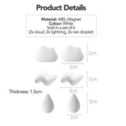 - Set of 6 magnets with 3 cute designs: cloud, lightning, and raindrop.