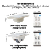 The solution: These compact stick-on wheels attach instantly, no drilling required. Choose between 360° swivel wheels for free movement in any direction, or 180° wheels for straight-line sliding.