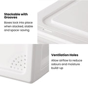The clear body makes it easy to identify your shoes at a glance, while the grooved top-and-bottom design ensures boxes stack securely without slipping. Built-in ventilation holes at the back help prevent odours and keep air circulating, so your shoes stay fresher for longer. From sneakers and heels to flats and sandals, these boxes transform cluttered floors into a tidy, dust-free shoe display thatβs easy to maintain.