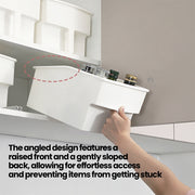 Designed for convenience, this storage bin features a uniquely designed handle for easy grip and retrieval, especially when storing items in high cabinets. The slanted front-to-back design allows for smooth access, preventing items from getting stuck. Its extended front edge provides a firm grip, making lifting and carrying effortless.